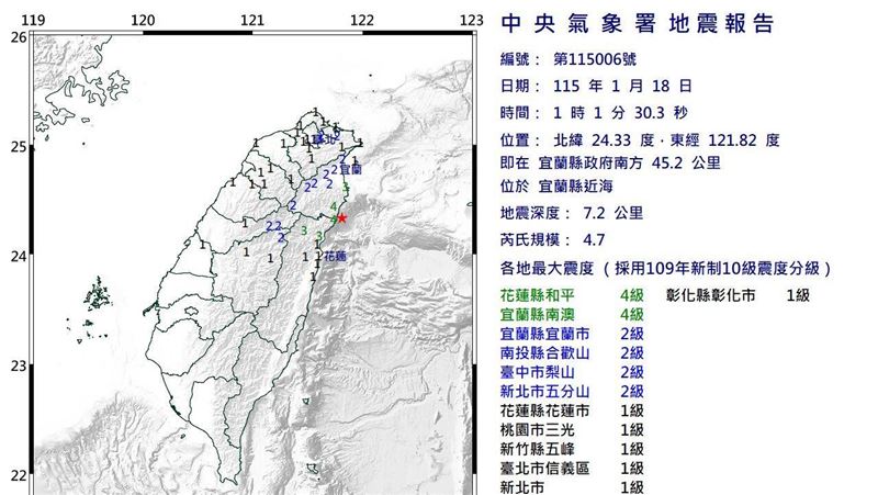 新/宜蘭近海4.7極淺層地震 宜花震度4級