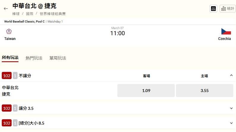 新/台捷大戰11:00開打!運彩最新賠率曝