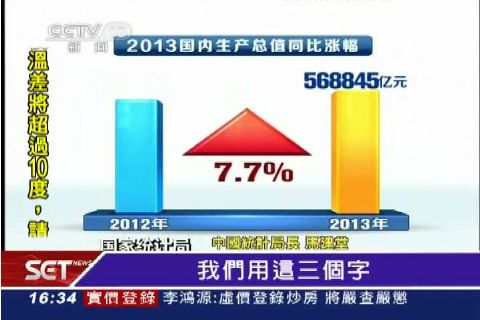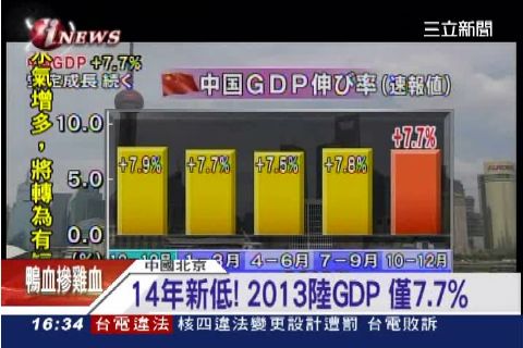 記者楊才蔚、陳文枋/綜合報導 中國今天公佈2013年的GDP增長數據,保8不成最終只有7.7%,創下14年來新低紀錄。 穩中求進,穩中向好的這種態勢,具體而言,我們用這三個字來形容一下就是穩、進、好。雖然官方刻意在媒體面前,表達對經濟環境的信心,但是7.7%是中國14年來GDP新低。 美國日本也媒體都重點報導這項數據,亞股除了台股跟韓國股市小漲外,其餘都是小跌走勢,而日前中國專家預測,2014年中國的GDP可能在7.5%跟8%之間,中國經濟改革成效恐怕也將牽動全球經濟復甦的態勢。