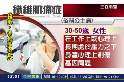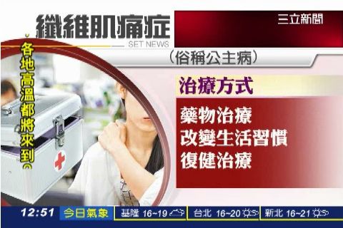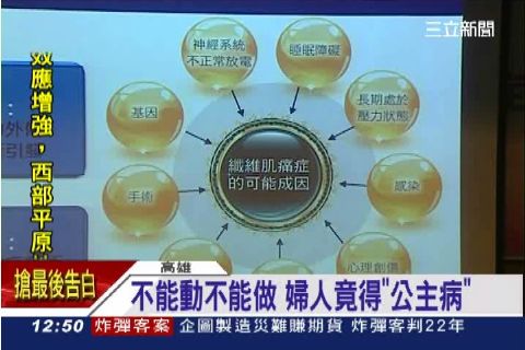 婦人一開始以為是關節出問題,沒想到痛的點範圍還擴及全身。劉婦表示,身體酸痛會改變,有時候是腳、有時候是背部、手、關節等,讓我不能動也不能做,還查不出原因。最後婦人到醫院檢查,經醫師診斷之後發現,原來婦人得到「纖維肌痛症」,也就是俗稱的「公主病」。高雄長庚神經內科主任莊曜聰說明病情:「較像肌肉性的疼痛,但是會更劇烈,還有僵硬感,通常一般人會受不了。」