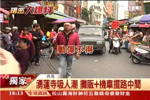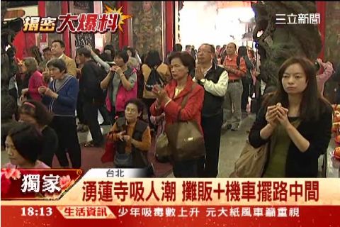 手拿香虔誠拜拜,農曆新年位於蘆洲的湧蓮寺裡頭人山人海,因該廟起源於清朝時期,歷史相當悠久,每年還會抽出國運籤,吸引不少民眾前往,但祭拜完後,要走過寺廟外面這條街常讓不少人很頭大。