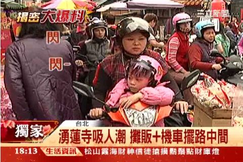 大家正在歡喜過年,但是蘆洲「湧蓮寺」附近的居民卻一個頭兩個大,因為每年農曆年間,這裡不但聚集不少攤販直接在路中間擺攤,甚至連機車也停放在路中間,讓居民十分擔心,要是一旦發生火災,消防車根本無法進來,而居民多次向警察反應,但卻也得不到改善。