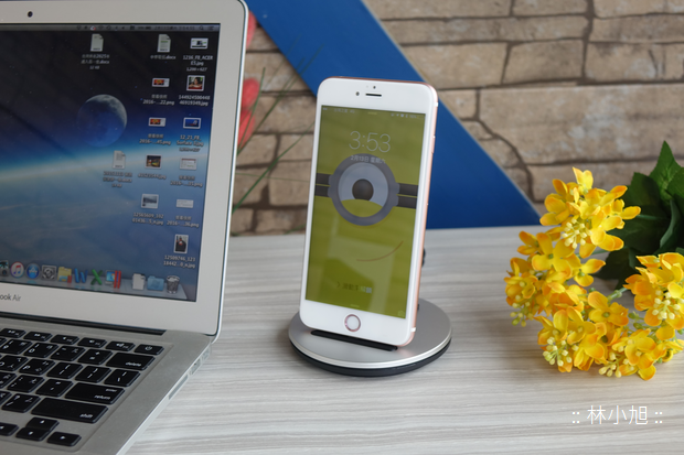 底座上面有 Apple 專屬的 Lightning 閃電充電接頭,且可以前後調整角度,相容於 iPhone 5/5s/6/6s 以及 iPad mini、iPod Touch 五代等機型,但比較可惜的是因為這個底座造型設計的關係,假如你的 iPhone 保護套、保護殼是有包到底端的設計,那麼就無法在這充電座上使用,購買前請特別注意!
