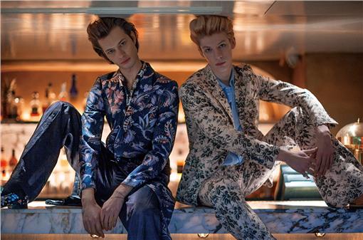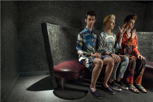 Valentin/藍色印白鶴圖紋睡衣襯衫、藍色印白鶴圖紋絲質短褲 by Louis Vuitton;黑色草底休閒鞋 by Dolce & Gabbana;咖啡色皮手環 by The Middle;Peter/白色印孔雀圖案半長袖絲質上衣、白色印孔雀圖案半長袖絲質長褲 by Dolce & Gabbana;黑色休閒鞋 by Dries Van Noten;黑色皮手環 by The Middle;Hadrien/紅色印彩繪襯衫、紅色印彩繪長褲 by Vivienne Westwood;咖啡色印圖麻布涼鞋 by Valentino;紅色麂皮手環 by The Middle
