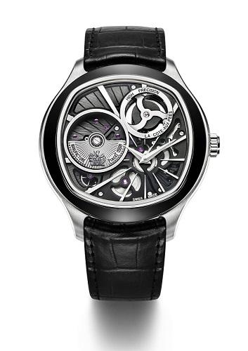 70是個既黑暗又明亮的時代,石英錶異軍突起,機械錶相對沒落,日本品牌奪下記憶點同時,有一部份瑞士傳統大廠也加入戰局,Piaget也是在這個時期的1976年,推出首款自製超薄機芯7P。自尋路數無可厚非,畢竟還是要在硝煙四起中求生存,不過今年在錶展成行前就已先看到的這枚為慶祝7P誕生40週年而推出的700P機芯,倒是頗令人意外。46.5mm枕型白K金錶殼中,搭載可儲能42小時結合石英與自動上鍊機械概念的700P機芯。省去概念中機械錶內的擒縱裝置,以錶面盤可見之微擺陀上鍊之動能通過似推進器裝置用以發電(10到11點鐘位置黑色圓盤即為此機構),再經過石英振盪及調節器輔助拿捏頻率(這裡是5.33Hz),來達到精準計時。雖乍看不禁想起日系品牌之模樣,但Piaget保證是取自73年瑞士工程師的專利,血統純正的很,深黑色機芯搭配黑色ADLC塗層錶圈也煞是俐落,限量118枚的概念,封號「奇葩」,也應該當之無愧。
