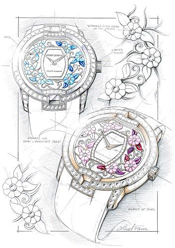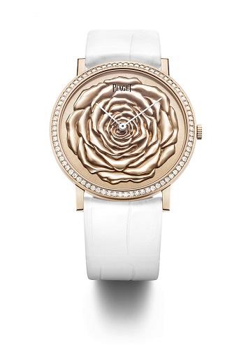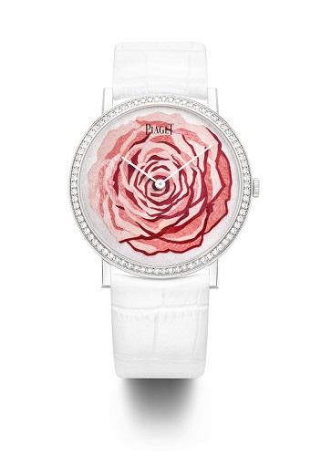 女人愛花,男人也愛花,大戲裡演的是連皇帝也愛逛御花園,而品牌董事長Yves Piaget對玫瑰的眷戀,是高到讓栽種公司都拿他的名字來為品種命名的程度,這種血脈上促成的美好姻緣,更成了Piaget讚揚女性優雅、細膩的表徵。自2012年藉著高級珠寶系列委身於錶盤上以來,每年我們都期待著80片花瓣將以何種姿態綻放,繼去年大明火琺瑯、微點畫,今年品牌換以木質細工鑲嵌及金質雕刻工藝勾勒。前者使用38mm白K金錶殼,後者使用38mm玫瑰金錶殼,均內載430P超薄手上鍊機芯。由Rose Saneuil完成的木質細工鑲嵌,使用深淺粉紅梧桐木、楓樹木片,加上白色珍珠母貝調色,依照其深淺色澤、大小形狀排列;而由Dick Steenman完成的金雕,則需花30小時始能琢磨完成,配合各限量8枚及18枚的品牌幸運數字,包準聞得到藝術氾濫的幸福。