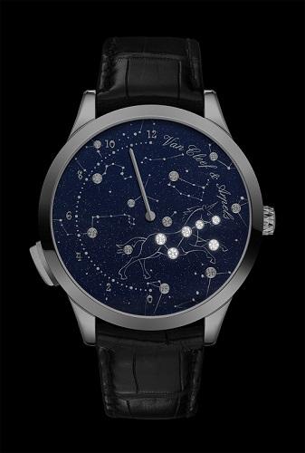 演繹時間的詩意,向來是Van Cleef & Arpels拿手好戲,花草飛鳥、天體運行,就算採用的是貴氣逼人的寶石,竟也能輕鬆寫意的拼湊出自然風景。雖說這味本就得貴婦名媛喜愛,但也有不少讓男人們念念不忘的佳作,Midnight Planetarium的腕上小宇宙就是其中之一。延續夜空觀察主題,品牌推出Midnight Nuit Lumineuse,42mm白K金錶殼,搭載可儲能40小時之自動上鍊機芯,砂金石玻璃面盤,鑲嵌如從北半球抬頭觀察星空中的繁星般鑽石點點,6點鐘至12點鐘位置配置逆跳小時指針,回應世家經典傳承。按下8點鐘位置按把,6顆構成獨角獸星座的美鑽發出白色光芒,非用電池,而是藉由機芯中內置瓷條震動產生壓電效應的電流供應。輪系傳動中,卻也道出了浩瀚星空的神祕色彩,陽剛味童話,本該就此開章。