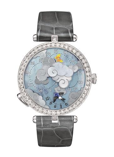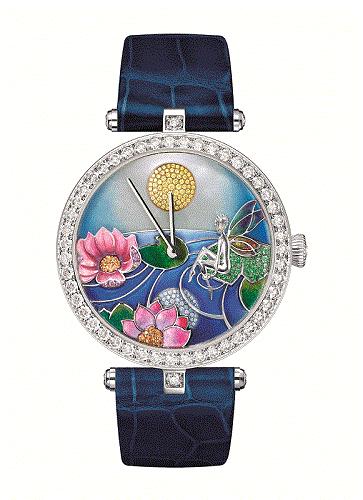 仙子下凡到人間,停留於如煙似幻境間的模糊畫面,只記得睡蓮上她輕盈的翅膀,以及以雙腳嬉戲於河面時的俏皮姿態,Van Cleef & Arpels的創作者們一定也做過一樣的夢,才能把這童話裡的場景於錶盤上還原。38mm白K金錶殼,搭載可儲能60小時及日夜顯示功能之自動上鍊機芯,源自2005年仲夏夜之夢系列之別針圖騰延伸,由沙弗萊石、剛玉等寶石鋪陳呈現靜謐柔美的精緻畫面。內填琺瑯繪製的水面,清透流暢,雖著分秒前行節奏,背景天空中日昇月起,渲染出金黃與湛藍,望向三點鐘位置,亦有婀娜身影陪伴24小時。婉約、靈巧,或許是來自1940創作年代的女人意象,佇立至今,依舊讓人怦然動心。