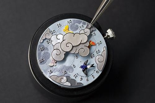 你進我退,你唱我和,跳首圓舞曲,主角並非紅男綠女,反而是自然中的盎然野趣。如果對品牌夠了解,當一眼看到Lady Arpels Ronde des Papillons,就能馬上評斷出朵朵白雲後必有蹊蹺,38mm白K金錶殼,搭載可儲能40小時之自動上鍊機芯,珍珠母貝為底的淡藍晴空,6點鐘位置象徵快樂的燕子以逆跳方式,用翅膀輕點小時,三個非等大圓弧圍繞的雲朵中,輕巧飛出一隻蝴蝶,停留在現在時間的分鐘之上。靜靜等待時機,30分後躲入雲朵中的白粉色,換上鮮黃,再由橙色結束回合,按下8點鐘位置按鈕,三隻蝴蝶翩翩起舞,亦應用同樣元素於自動擺陀雕花裝飾中。緩拍,加速,快轉,盤旋,趁著幸福滴答配樂,與分秒共舞。