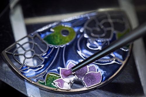 第一層,酒桶偏圓的外型,第二層,花團錦簇的圍繞,直搗核心,時分針游移間,闖入女人心事,落下一句暗語:「I am Feline」。柔媚感十足的Blossom Velvet,放大女人如貓般的神祕性感,36mm白K金或玫瑰金錶殼,搭載通過日內瓦認證的RD821自動上鍊機芯,可儲能42小時。大明火琺瑯錶盤上,以錶殼相同材質延伸出的藤蔓纏繞、彎折,最後再由藍色、粉色等豔麗琺瑯花瓣、葉片,簇擁出其中珍稀難得之鑽石花蕊,立體感十足。當然璀璨不止於此,白色珍珠母貝錶盤,整體鑲嵌的413顆美鑽(約3.48克拉),藉此工藝與身形,再一次陶醉在「稀世藝品珠寶師」的傑作裡。