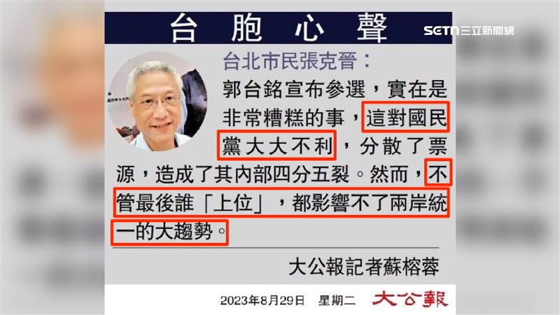 領銜人張克晉自稱是「教育文化工作者」,現在被民進黨立委林楚茵爆料,他長年跟中國密切合作的紅統打手,根據張克晉個人自介上頭寫著是大陸教育部傳統文化教育核心專家,不只如此還因為郭台銘擬參選總統,張克晉還提到對國民黨大不利,最後不管誰上位,都影響不了兩岸統一大勢。