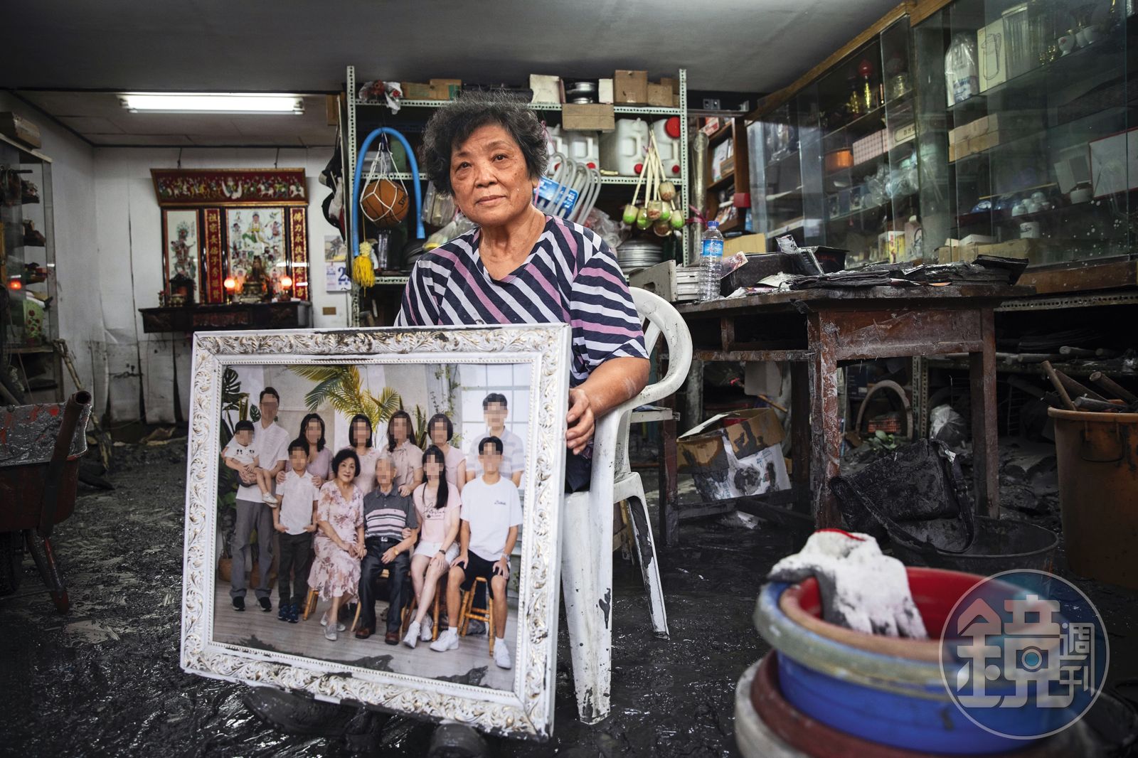 鈔票、硬幣沖洗完仍可使用,照片卻因沾上泥沙,畫面褪色。突然黃碧雲想到什麼,起身走到東倒西歪位移傾斜的櫃子探頭,之後麻煩志工在縫隙裡拔出卡在泥中的全家福照片。她拿著水管小心沖洗,「我先生罹患癌症,我們知道他可能快不行了,2年前的中秋節我們特別去拍合照,女兒、女婿、孫子都在。」幸好屬於一家人的回憶有被搶救回來。