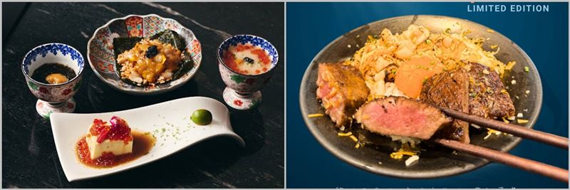 生食級北海道干貝、油花分布細緻的和牛肉片,以及肥美沙公蟹,三大主角一次到齊。(圖/業者提供)海膽套餐自前菜開始就令人驚豔:雲丹干貝柿種魚子醬、松露山藥海膽佐小豆島醬油、和風蟹肉鮭魚卵豆腐,每一道都以海膽點綴,視覺與味覺皆奢華;特製的「海膽醬」更是亮點,拌入蘿蔔泥與蒜泥,不管搭配肉品或海鮮,都能勾勒出極致鮮味。