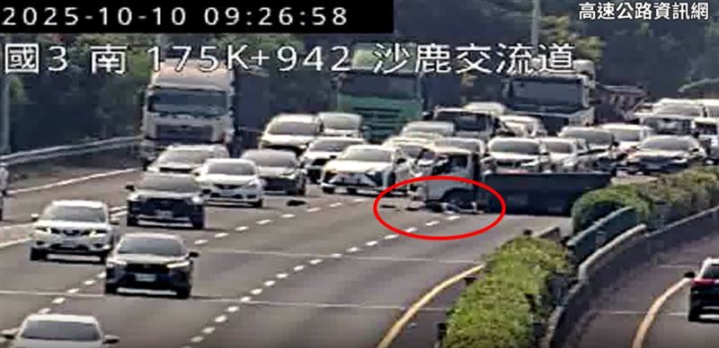 國道3號沙鹿交流道附近發生自撞車禍,造成車內2人拋飛。(圖/翻攝畫面)國慶連假首日,國道發生驚悚車禍,今日(10日)上午9時許,一輛小貨車行經國3北上176.6公里時,因自撞內側護欄,導致車內2人拋飛,掉落在車道上,幸好二人經送醫救治後均無生命危險。由於小貨車占用中內線車道,也造成車陣回堵約4公里遠,目前警方正在排除事故,詳細車禍發生原因仍有待調查釐清。