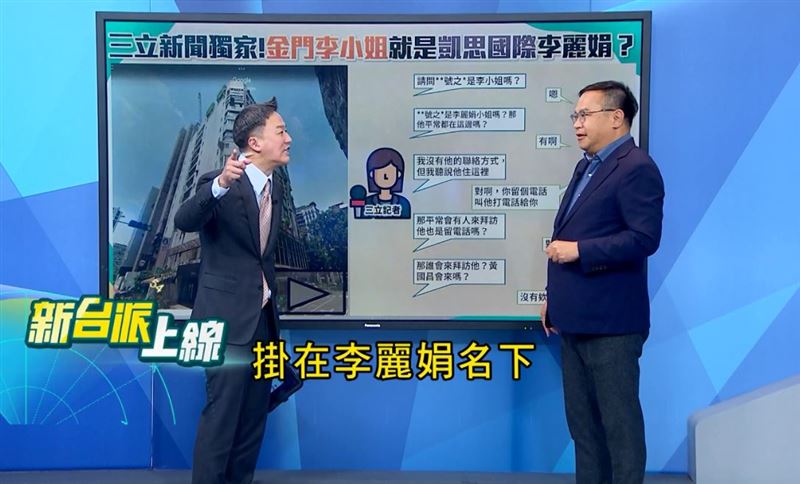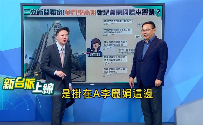 民進黨立委王義川與主持人李正皓在節目中抽絲剝繭:「黃國昌老婆的戶口寄李麗娟家、狗仔公司李麗娟開」這關係能切得清?(圖/翻攝自新台派上線)民眾黨主席黃國昌涉入「養狗仔」爭議風暴,外界持續追查金流來源。據三立政論節目《新台派上線》最新揭露,負責支付狗仔薪水的公司-凱思國際,其代表人李麗娟,不僅與黃國昌的家族關係撲朔迷離,更被查出與黃國昌板橋服務處的登記地址、以及其妻高姓家族名下房產有驚人重疊。