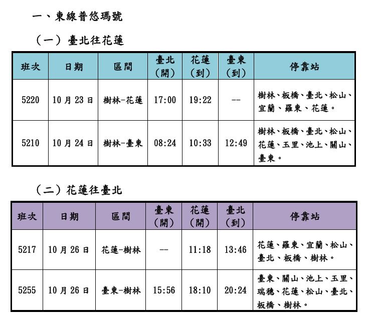 台鐵指出,此次加開列車包括普悠瑪號4列次、EMU3000型自強號10列次,並針對東部地區運能需求,於10月25日增開湖口—台東間5466次及5467次區間快車各1列次,以協助舒緩花東線車票緊張情形。