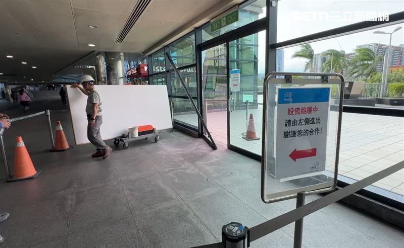 高鐵台中站大門因玻璃材質無法馬上維修,暫時用木夾板擋住。(圖/翻攝畫面)