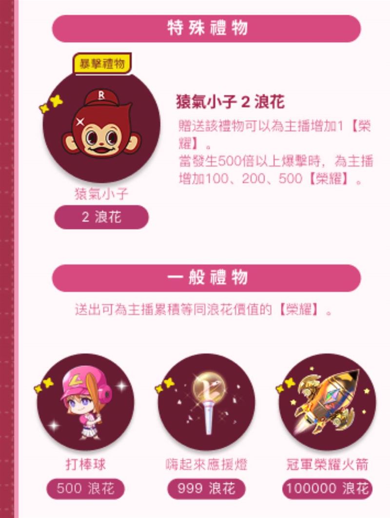浪LIVE直播宣布推出為期七天的「冠軍狂賀活動」,從29日零時起,限時7天,推出4款應景禮物,包含印有樂天LOGO的「猿氣小子爆擊禮」。另外,粉絲還有機會可以狂抽百萬浪花,共抽出92個名額,總獎金高達103萬浪花。還有永久勳章珍藏,只要累積贈送滿100,000浪花,即可永久珍藏「樂天桃猿冠軍限定勳章」。