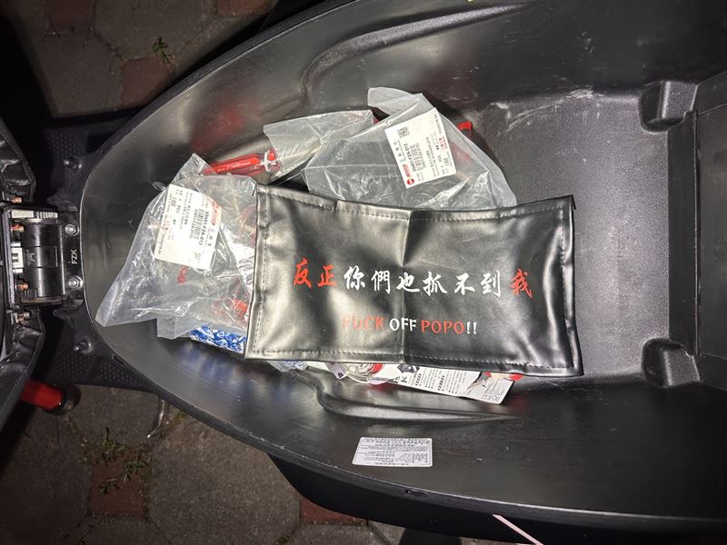 除此之外,改裝車身還貼有「那又怎樣 撞柱當隊長」貼紙,座墊下的置物箱內還有1塊印著「反正你們也抓不到我 FXXK OFF POPO!!」的車牌皮套,囂張字眼,讓員警看了直搖頭,當場告知查扣車牌,必須重新驗車才會重新發牌照,面對警方查緝,柯女則是神情尷尬、支吾其詞。
