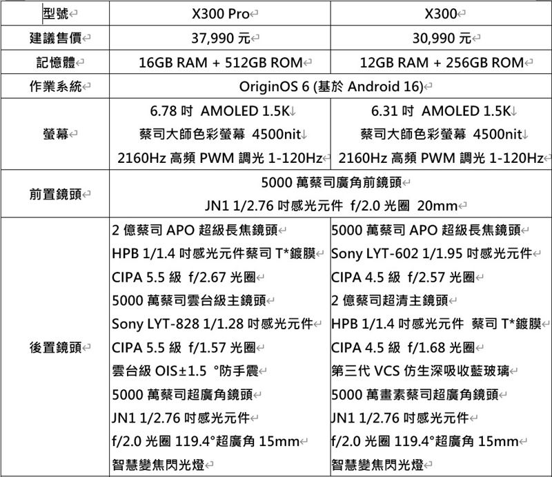 全球手機影像邁入新紀元,vivo今(31)日再次攜手聯發科技與蔡司,推出全新vivo X300極限旗艦系列。vivo X300 Pro推出16GB RAM+512GB ROM,沙漠棕、雪峰白、晴空藍、星辰黑四色,建議售價 37990元;X300推出12GB RAM+256GB ROM,晴空藍、星辰黑、山嵐紫、晨曦粉四色,建議售價30990元。