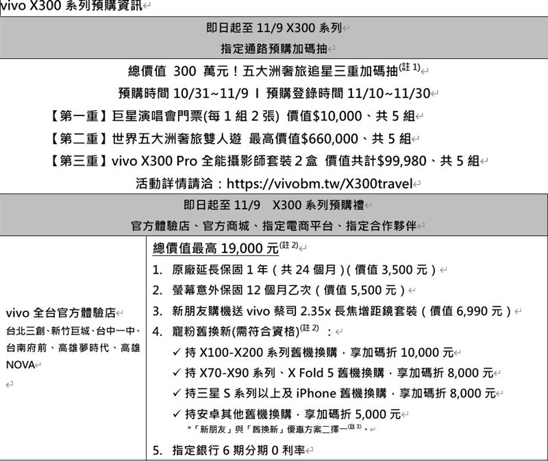 針對偏好線上購物的消費者,vivo同步推出加碼回饋,凡於官方商城預購,即贈統一超商禮券5,000元;於指定電商通路預購X300 Pro並完成登錄者,可獲得旅遊券5,000元;預購X300則可獲得vivo蔡司2.35x長焦增距鏡套裝;於指定經銷通路參加預購的消費者,亦可享舊換新最高5,000元加碼優惠。針對指定通路vivo更祭出「五大洲奢旅追星三重加碼抽」,讓每位預購者都有機會成為幸運之星!凡於指定時間完成登錄,即有機會同時獲得巨星演唱會門票、世界五大洲奢華雙人旅遊,和vivo X300 Pro全能攝影師套裝,vivo以實際行動回饋V粉支持,誠意滿滿、好禮再升級,讓消費者在換機同時感受超越期待的旗艦禮遇。