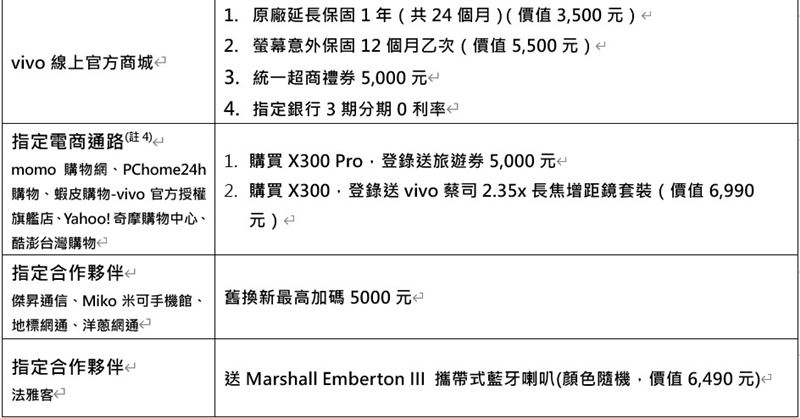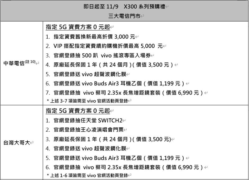 vivo推出電信資費預購專案,搭配中華電信、台灣大哥大與遠傳電信指定資費方案,X300系列最低可0元起輕鬆入手。凡完成vivo官網登錄,即可抽vivo蔡司2.35x長焦增距鏡套裝,並加碼贈送vivo Buds Air3耳機等好禮。針對各家電信,vivo也祭出豐富回饋,中華電信用戶搭配指定資費舊換新最高折抵3,000元,更可享VIP搭配指定資費續約購機折價最高5,000元,官網完成登錄再抽500趴vivo搖滾專區入場券;台灣大哥大預購完成登錄,可抽任天堂Switch 2及王心凌演唱會門票,並且搭配指定資費舊換新最高折抵3,000元;遠傳電信預購加碼舊換新最高折抵3,000元,VIP續約再享最高5,000元折價,官網登錄更可抽宇宙人演唱會門票,搭配指定方案享遠傳friDay影音暢看2個月、Spotify Premium首次訂閱前4個月免費、信用卡/無卡分期0利率,讓你輕鬆換新機,遠傳買空機再加碼送DJI手持攝影套件!多重優惠與專屬好禮同步加碼,X300系列不僅輕鬆入手,更化身演唱會與旅拍旗艦神機,捕捉每個精彩瞬間。