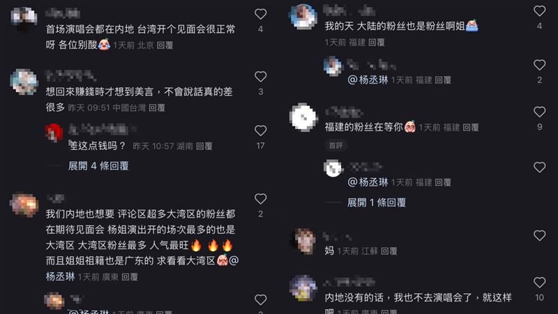 楊丞琳即將回台舉辦見面會的消息曝光後,不僅引起台灣歌迷熱烈迴響,陸網反應更是激烈,不少中國粉絲直呼羨慕,湧入楊丞琳社群表示:「中國粉絲也是粉絲啊」、「內地沒有的話,我也不去演唱會了,就這樣吧」、「憑啥台灣吃這麼好?」不過隨後有人喊話網友保持理性,發聲緩頰:「評論區的你們不要再給丞琳壓力了好不好,她這幾年一直在內地活動,回台灣基本就是探親。代入一下台灣的粉絲,兩三年見不到人,真的很難過了。」