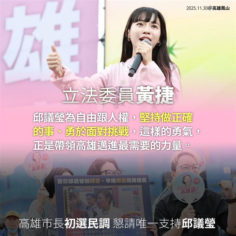 民進黨高雄市長初選白熱化,立委邱議瑩11月30日在鳳山區舉辦首場大造勢,包括前行政院長蘇貞昌及同黨立委黃捷、林楚茵、前總統陳水扁等人出席。邱議瑩今(2)日在社群發文,秀出五張圖卡,其中一張許多人感到訝異,原來歌手許志豪竟是邱議瑩的前辦公室助理!