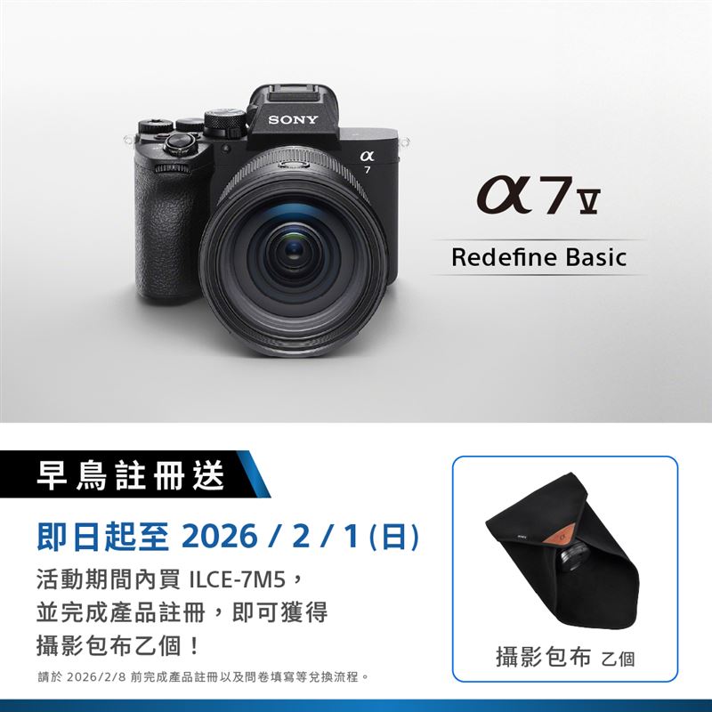 即日起至2026/2/1,買ILCE-7M5,並完成註冊及填寫問卷,即可兌換攝影包布乙個。 。