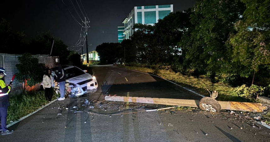 據了解,31歲越南籍的高姓駕駛晚間載著26歲的女性友人,駕駛車輛行經該處,卻不慎自撞猛撞路旁的電線桿,強大撞擊力道當場造成電線桿被撞飛,整根橫躺在路中,高男所駕駛車輛車頭嚴重凹陷毀損,安全氣囊爆開,造成副駕駛座的友人頭部撕裂傷,所幸其意識清楚,被緊急送往桃園醫院新屋分院救治。