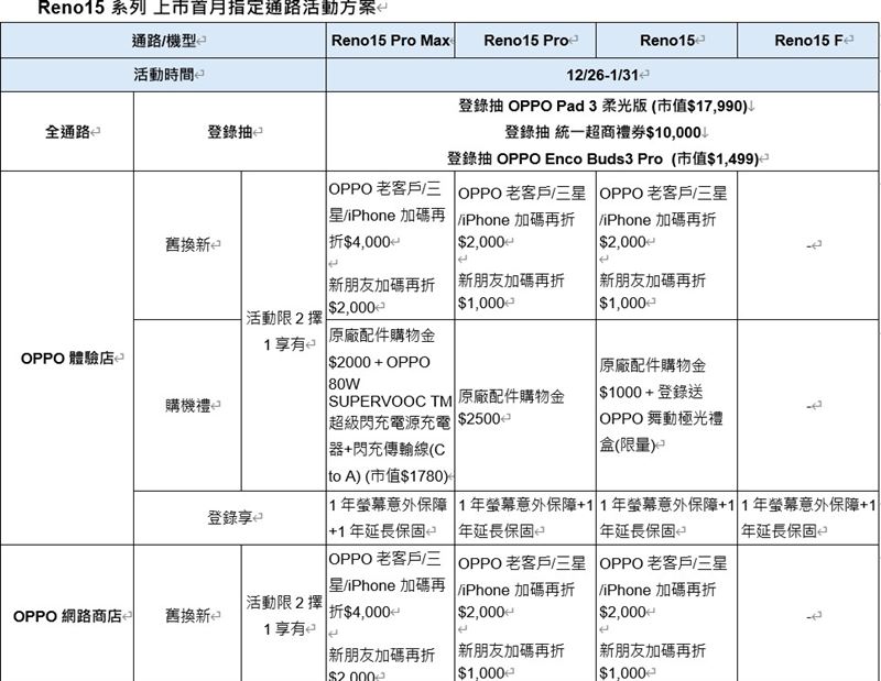 各通路購機享多重優惠,凡於活動期間購買即享登錄抽平板、耳機與超商禮券;於OPPO體驗店及OPPO網路商店購買,享舊換新加碼或購機禮,指定機型舊換新最高加碼再折NT$4,000元,登錄再享螢幕意外保障與延長保固。購買Reno15登錄再送限量OPPO舞動極光禮盒,舊換新加碼與禮盒贈禮二擇一享有。