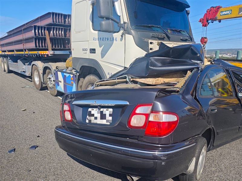 國道3南下彰化和美路段,一名轎車遭聯結車追撞,駕駛受困車內,經送醫仍因傷重宣告不治。(圖/翻攝畫面)