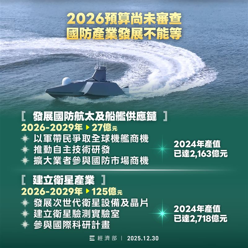 經濟部說明,規劃在2026年至2029年間,有系統性地繼續推動國防產業發展,如航太、船艦、無人載具及衛星產業,以軍帶民爭取全球機艦商機、推動自主技術研發,到建立無人機認證體系、測試場域與操作人才,再到發展次世代衛星設備與晶片、接軌國際科研計畫。