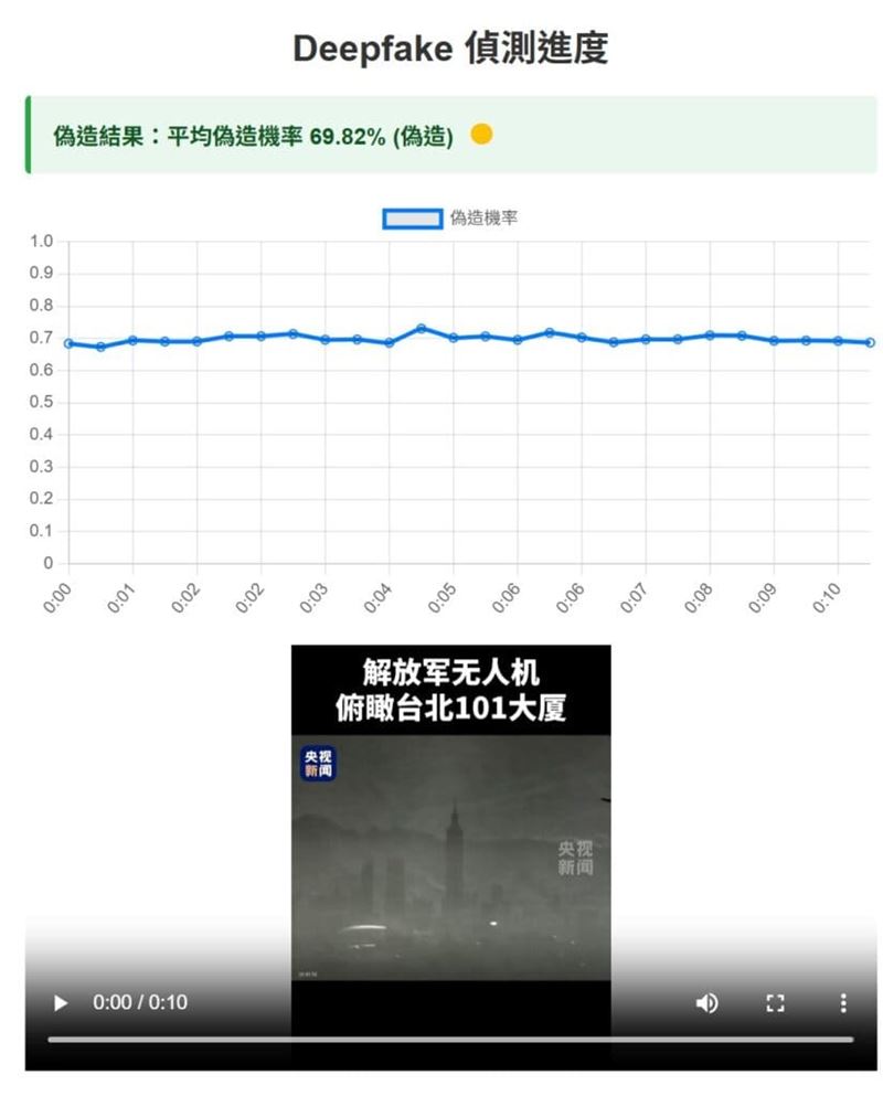 經AI偵測工具檢測,中共公布影片有變造的可能性/陽明交大許志仲提供。(圖/翻攝自查核中心網站)