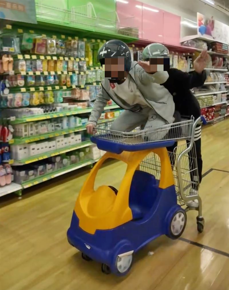 中國社群平台近期流行拍攝「重慶重機」影片,有許多網紅模仿拍攝,未料台中有2名男子前往家樂福青海店內,以賣場內的兒童專用嘟嘟車當成重機,低成本模仿拍片。透過影片可見,其中一名男子負責擔任推車「駕駛」,另一人則站在推車後方擔任「乘客」,過程中2人在賣場通道間高速滑行、甩尾,甚至還站立在推車上放開雙手、雙手比愛心等動作,相當危險。