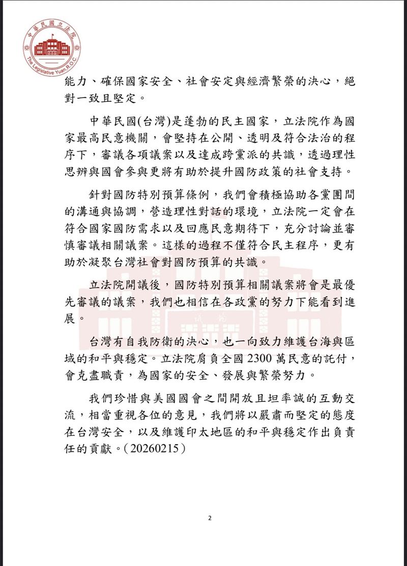 周軒則是指出,立法院在丙午年除夕這天發出新聞稿,回應美國30多位參眾議員致函韓國瑜院長等人,關心國防預算審議狀況。重點只有一個:「立法院開議後,國防特別預算相關議案將會是最優先審議的議案,我們也相信在各政黨的努力下能看到進展。台灣有自我防衛的決心,也一向致力維護台海與區域的和平與穩定。立法院肩負全國2300萬民意的託付,會克盡職責,為國家的安全、發展與繁榮努力。」