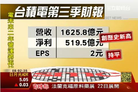 台積電昨天(10/17)舉行法說會,公布上季稅後純益519.5億元,再創單季新高,每股純益2元符合法人預期;前三季EPS5.53元,同創新高。董事長張忠謀並釋出三大喜訊:首先半導體這一波庫存調節,這一季末就會修正完成;第二點明年全球經濟、半導體景氣都會成長;第三項則宣佈台積電未來兩年營運,將再衝新高、稅前盈餘年複合成長率將持續超過10%。