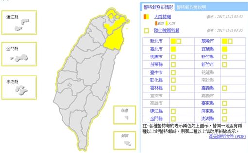 生活中心/綜合報導受到東北風影響,今(11)日清晨3時35分,氣象局針對台北市、新北市、基隆市、宜蘭縣發布大雨特報,基隆北海岸、宜蘭地區及大台北山區有局部大雨發生的機率,請注意。▲圖/翻攝自中央氣象局另外,東北風增強,台灣中部以北、東南部(含蘭嶼、綠島)、恆春半島及澎湖、金門、馬祖沿海、空曠地區及鄰近海域易有9至10級強陣風,沿海並有較大風浪,海邊活動請注意安全。