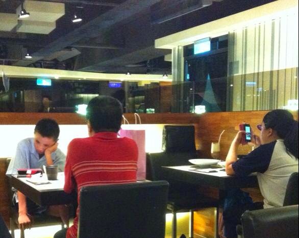 整個過程中只見男孩緊盯手機螢幕,不管父親怎麼跟他講話,男孩頂多看了父親一眼後,沒答話眼睛又飄到手機銀幕。最後父親只能孤單的呆坐椅子上自己吃東西,跟隔壁有說有笑的父女形成強烈對比。直到用餐完畢,才聽到男孩說:「可以走了!」雖然不清楚是否有什麼不為人知的隱情,或者單純沉迷3C世界,看在眼裡總是有股淡淡的哀傷。
