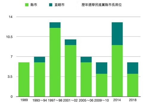 1986年民進黨建黨,1989年參加縣市長選舉,馬上就贏得了包括最大縣台北縣在內的6席縣市長,此後到2018年改選前,6席就是民進黨席位的樓地板了,此後有起有伏但是大方向是成長,到了2014年一舉獲13席縣市長位置,不料在建黨的第32年,居然敗到回到創黨後第一次縣市長選舉的原點,剩下6席,而且第一到第四大直轄市全部淪陷,所轄人口只有574萬,不到台灣總人口的四分之一,比1989年的6縣市超過700萬人口(當時),占全國三成五少得非常多!