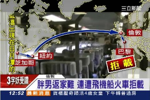 體重太重、噸位太大的人,每次要搭飛機旅行,免不了要看航空公司或是身旁乘客的臉色。法國一名230公斤重的男子,連續被航空公司、油輪和火車拒絕搭載,他們利用無法確保他旅途平安或遇到災難時會妨礙疏散等理由,讓原本10幾個小時就可以回到家的路途,這位男子卻耗時長達3個禮拜。