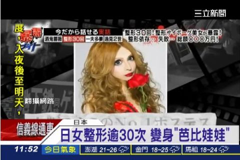 日本知名的整形例子,這個女生前後花了快700萬台幣,整形30多次之後,原本的東方面孔,現在看起來就像個芭比娃娃。她不但上節目,還出書分享整形經驗,她說:因為外表的關係,小時候常遭遇霸凌,才會整形。專家提出警告,整形如果建立在扭曲心態上,可能會導致精神疾病。