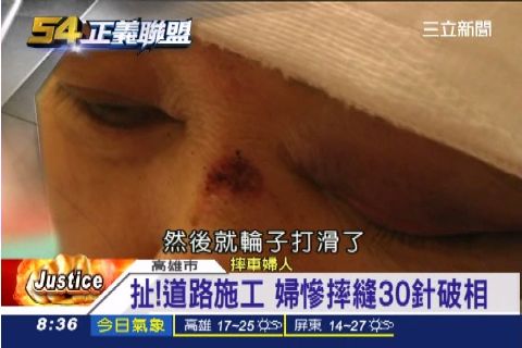 婦人頭部用紗布包的像木乃伊,紅腫的嘴巴還縫了三十幾針,因為道路施工形成高低落差,摔到鼻青臉腫,事隔一個多月嘴唇和下巴的縫線還清楚可見,傷口隱隱作痛。