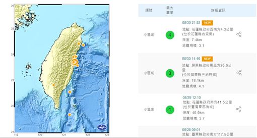 根據中央氣象局最新資訊,今(30)天晚間9時52分發生芮氏規模3.1地震,地震深度7.4公里,震央位於花蓮縣政府西南方4.3公里(位於花蓮縣吉安鄉),最大震度花蓮縣4級。