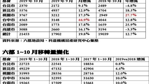 六都2019年10月總計2.14萬棟,相較上月1.79萬增2成,相較2018年同期也增約13%,則以桃園市年增27%最多,六都累計1~10月將近19萬棟,相較2018年同期逾17.5萬棟,年成長8.1%,相較2017年同期16.6萬棟,也增14.6%,顯見房市逐年復甦回溫。