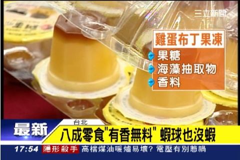 食安問題重重,消基會抽查市售16款商品,發現名不符實狀況非常嚴重!雞蛋布丁果凍沒有雞蛋、荔枝果凍也沒有荔枝,就連火鍋料常見的冷凍蝦球,也是用魚漿跟花枝丁做出來的,最重要的蝦子竟然沒有,連蝦味道從哪裡來也完全沒標示。消基會痛批,食安出包,業者頂多罰20萬,難怪不痛不癢。
