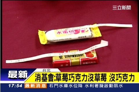 消基會上個月隨機抽查賣場16款商品,赫然發現「看到的不等於吃下肚的」,像是水蜜桃薄荷糖沒有水蜜桃,老牌水果軟糖不含水果,儘管有寫水果口味兩個字,但字太小,消費者根本看不清楚。水果軟糖業者:「若消費者對口味或風味這兩個字看得不是那麼清楚,我們會盡快作包裝上處理。」