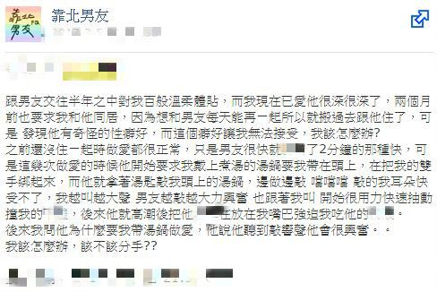 原PO曾在臉書《靠北男友》指出,她和男友交往半年,男友待她溫柔體貼,在2個月前小倆口也開啟同居模式;不過,原PO竟意外發現男友的性癖好。原PO指出,每當他們恩愛時,男友總會要求她將湯鍋戴在頭上,再把她的雙手綁起來,接著男友會拿著湯匙敲原PO頭上的湯鍋,「噹噹噹」聲不斷在耳邊迴繞,讓原PO近乎崩潰。
