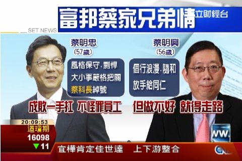 富邦蔡明忠、蔡明興有意分家,其實已經傳了一陣子,金融圈人士分析,蔡家兩兄弟各自管理事業體並沒有不好,因為蔡明忠行事保守剽悍,大小事嚴格把關,向來有蔡科長的綽號,弟弟蔡明興個行隨和放手讓下屬做,個性大不同的兩人各自發展對集團也許是好事。
