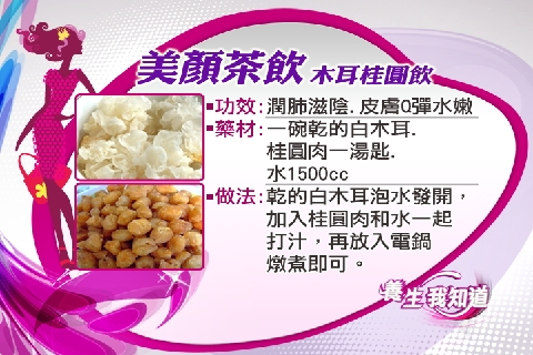 @美顏茶飲 藥材:一碗乾的白木耳、桂圓肉一湯匙、水1500cc。 做法:將乾的白木耳泡水發開、加入桂圓肉和水一起打汁,再放入電鍋燉煮即可。 功效:龍眼肉甘溫入脾經,能養血養顏;而木耳甘平入肺,能潤肺滋陰,且富含植物性膠質-和水溶性纖維以及17種以上氨基酸,可以補充天然的膠原蛋白和幫助腸道蠕動。